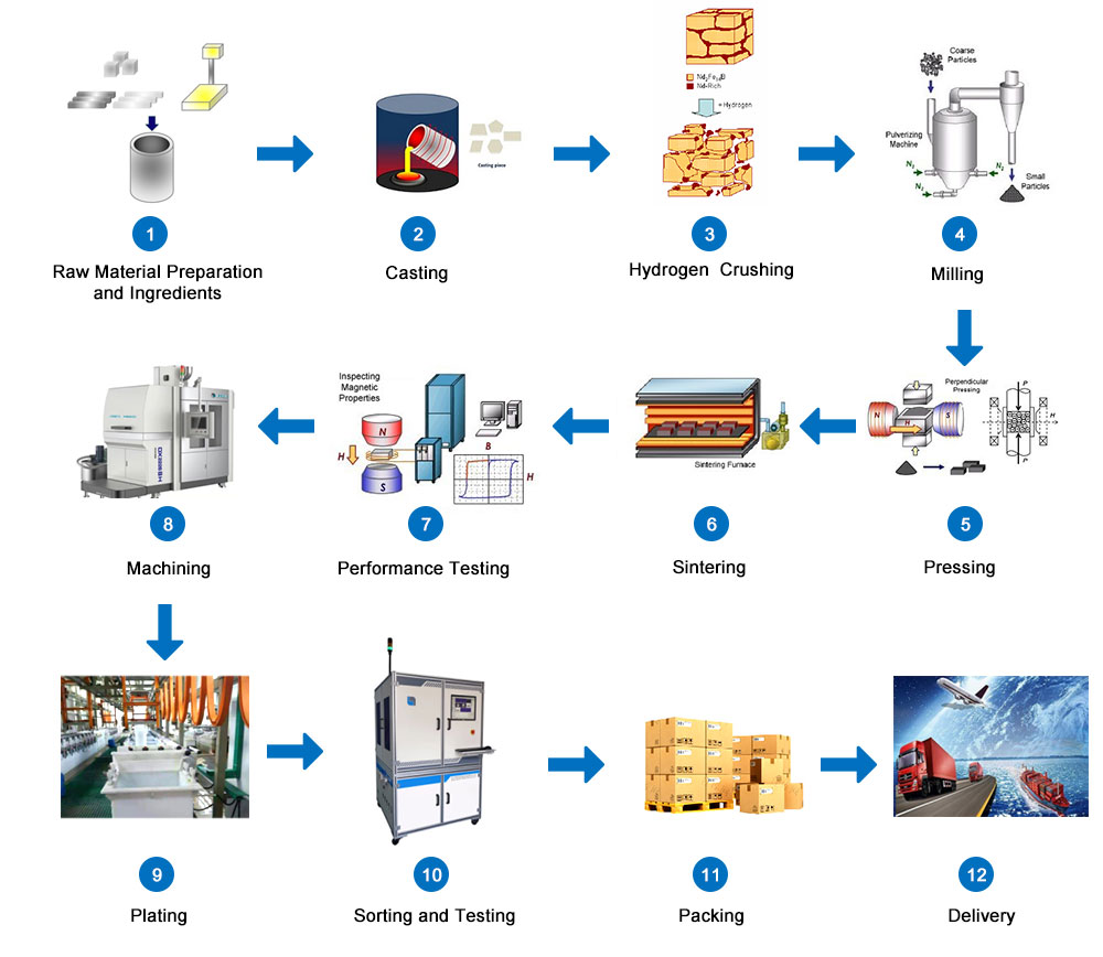 1. Projeto de composição: O projeto de composição do NdFeB sinterizado é muito importante. Relaciona-se se a qualidade do produto e os indicadores de desempenho magnético podem atender aos requisitos do cliente, porque muitas propriedades magnéticas intrínsecas do material, como polarização magnética, temperatura Curie, etc. O princípio básico do projeto da composição é garantir um desempenho intrínseco suficientemente alto, ao mesmo tempo que considera de forma abrangente os custos dos materiais. (O custo das matérias-primas representa cerca de 65% -90% do custo total dos materiais NdFeB sinterizados. Sob a premissa de atender aos requisitos de desempenho magnético do usuário, componentes baratos devem ser usados tanto quanto possível, e metais de terras raras e outros materiais de metais preciosos devem ser usados menos)