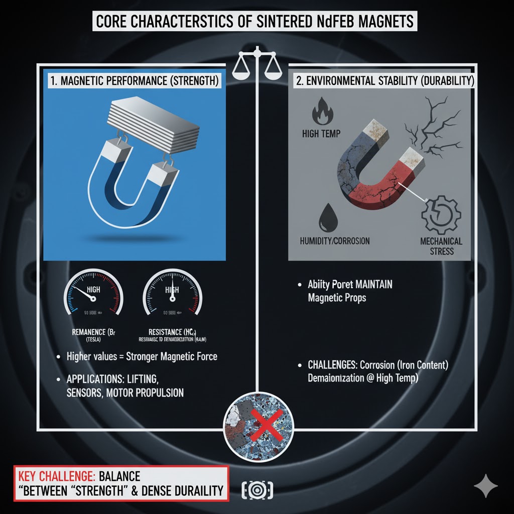 Os ímãs sinterizados de NdFeB (neodímio-ferro-boro) estão entre os ímãs permanentes mais fortes disponíveis, amplamente utilizados em indústrias como eletrônica, automotiva e energia renovável. Suas “características principais” giram em torno de duas propriedades conflitantes, porém críticas: desempenho magnético e estabilidade ambiental. O desempenho magnético é definido por métricas como remanência (Br, a densidade máxima do fluxo magnético) e coercividade (HcJ, a resistência à desmagnetização) – valores mais altos significam força magnética mais forte para tarefas como elevação, ativação de sensores ou propulsão motora. A estabilidade, por outro lado, refere-se à capacidade do ímã de reter essas propriedades sob condições adversas: temperaturas altas/baixas, umidade, corrosão ou estresse mecânico. Os ímãs NdFeB sinterizados tradicionais são naturalmente propensos à corrosão (devido ao seu teor de ferro) e podem perder magnetismo em temperaturas elevadas, tornando o equilíbrio entre “resistência” e “durabilidade” um desafio importante para fabricantes e usuários.